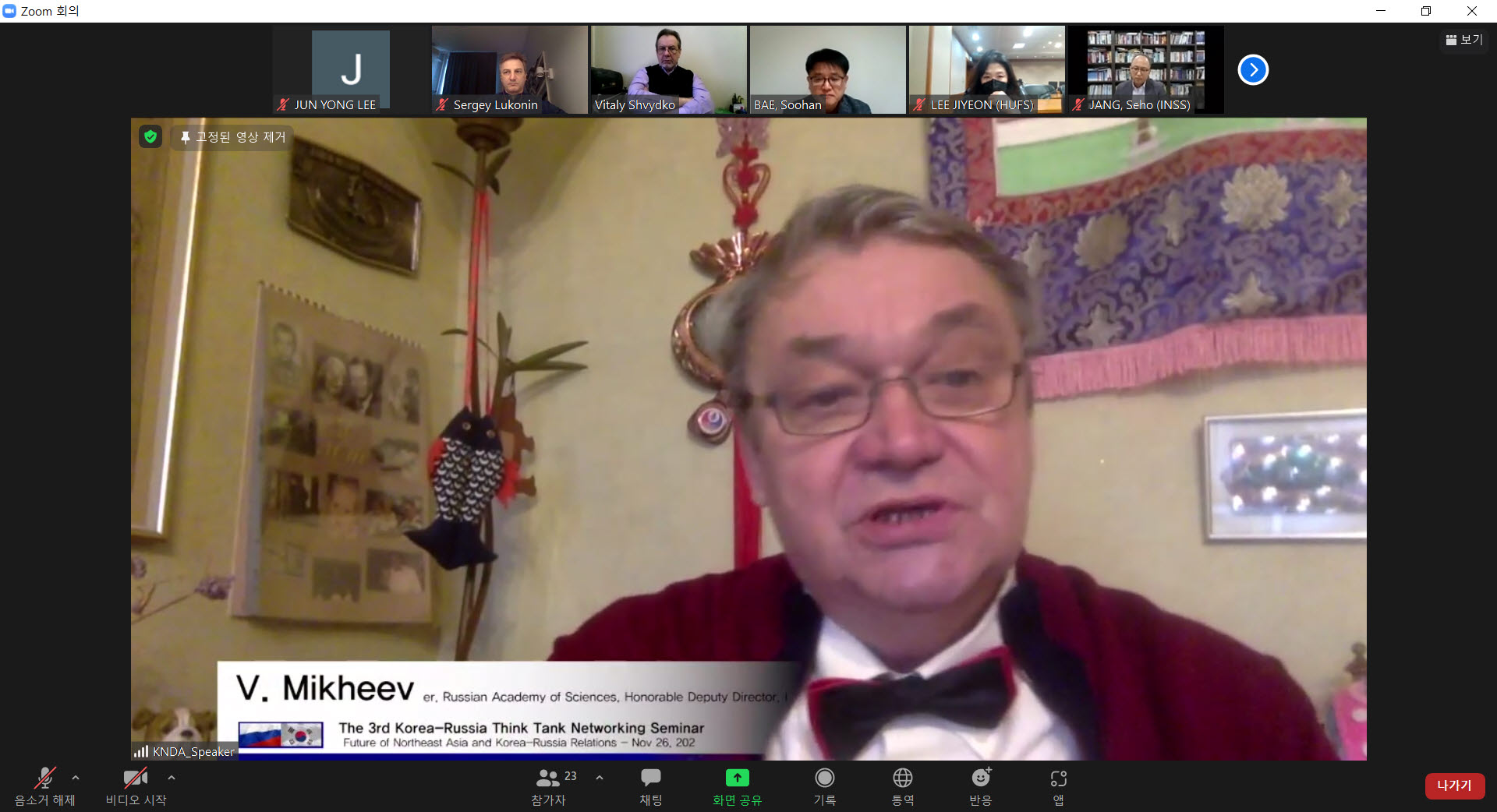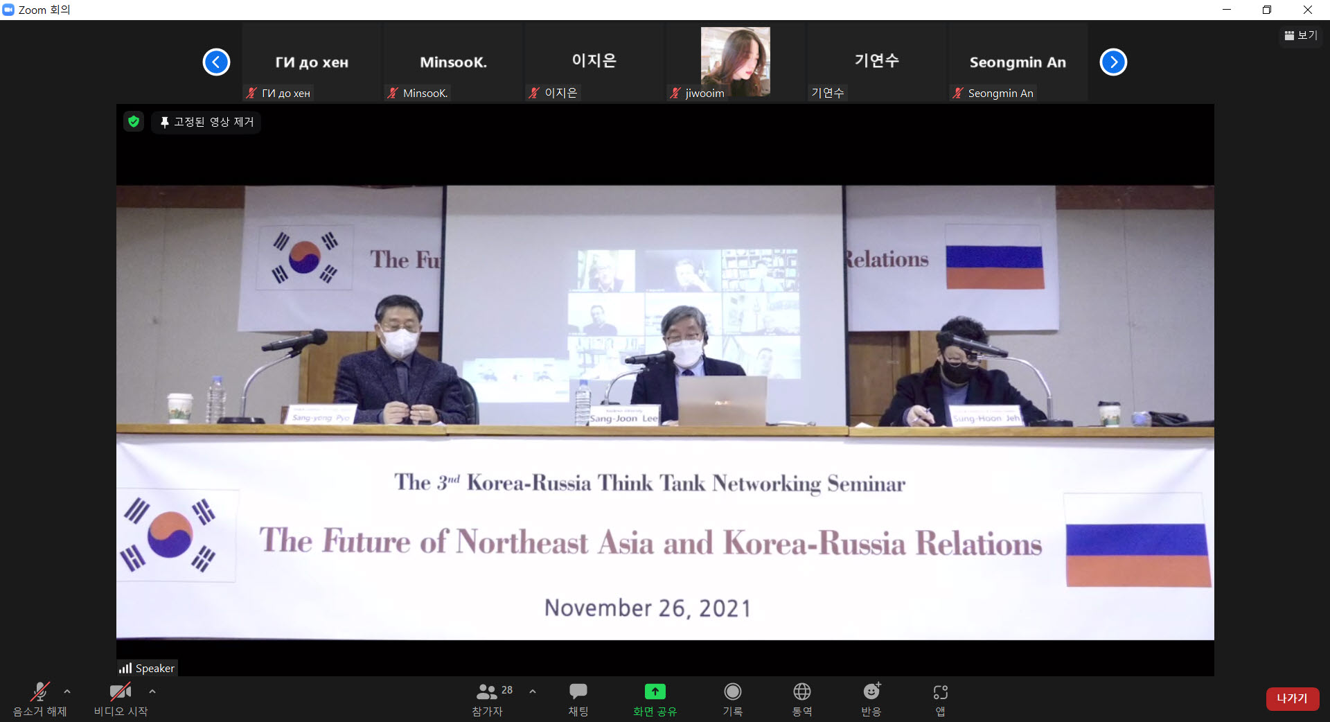 그 세 번째 행사로 러시아학술원 산하 세계경제 및 국제관계연구소 (IMEMO)와 공동으로  '동북아시아의 미래와 한러관계 '라는 주제로 세미나를 진행하였다 . 11월  26(), 한국외대 교수회관  2층 대강연실에서 진행된 이번 학술 컨퍼런스는 제 1세션에서  한국과 러시아의 동북아 전략 협력의 현실과 전망 과 제 2세션  동북아 경제 안보 관계와 초 국경 상호작용 이라는 주제로  14명의 러시아와 한국의 전문가들이 참여하였다 .