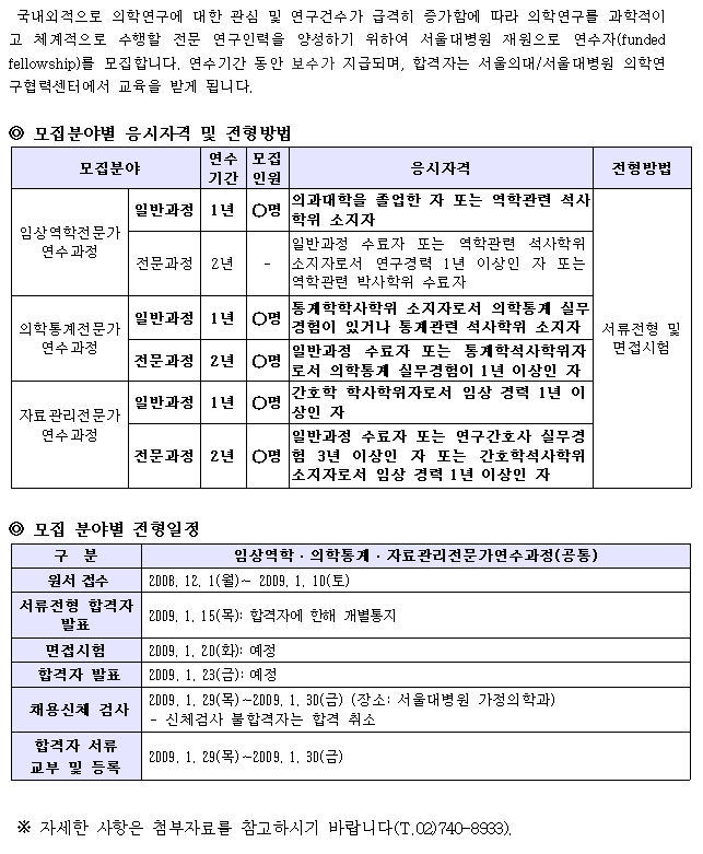 서울대병원에서 약물역학/의학통계/자료관리전문가 연수과정의 연수자를 모집하오니,