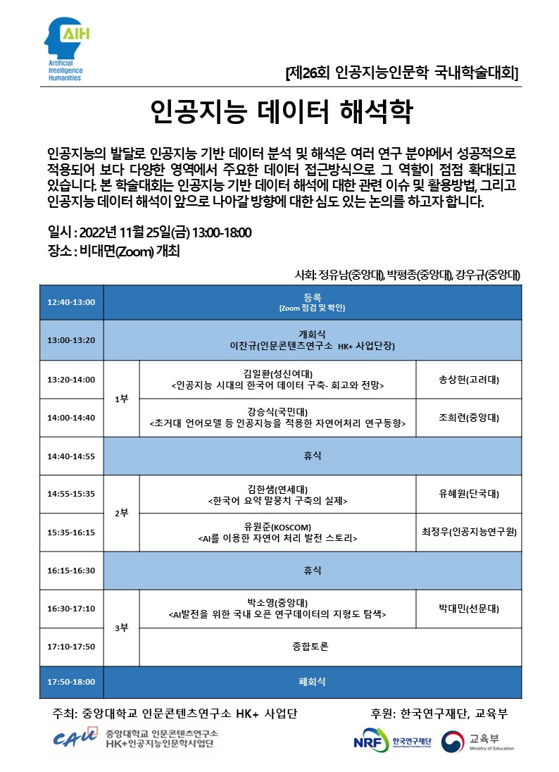 다가오는 2022년 11월 25일, “인공지능 데이터 해석학”이라는 주제로 제26회 국내학술대회를 개최하고자 합니다
