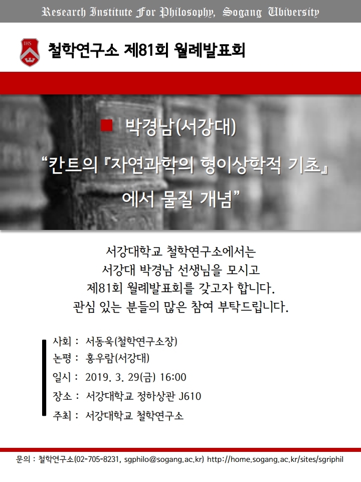 3월에 개최되는 서강대 철학연구소 월례발표회 일정을 다음과 같이 안내해드립니다.