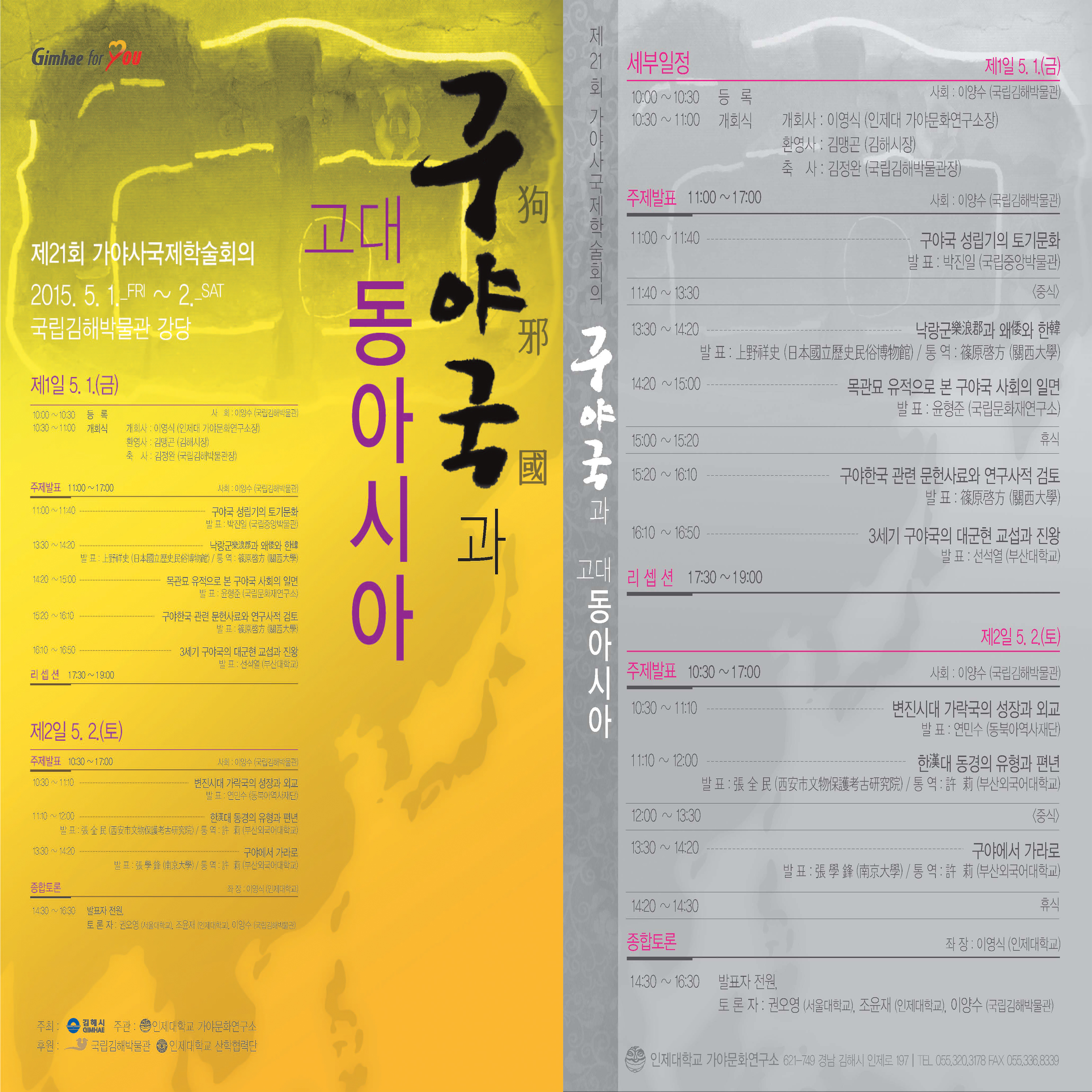 ○ 주 제 : 구야국과 고대 동아시아 ○ 일 시 : 2015. 05. 01(金) ~ 05. 02(土) ○ 장 소 : 국립김해박물관 대강당 ○ 주 최 : 김해시 ○ 주 관 : 인제대학교 가야문화연구소