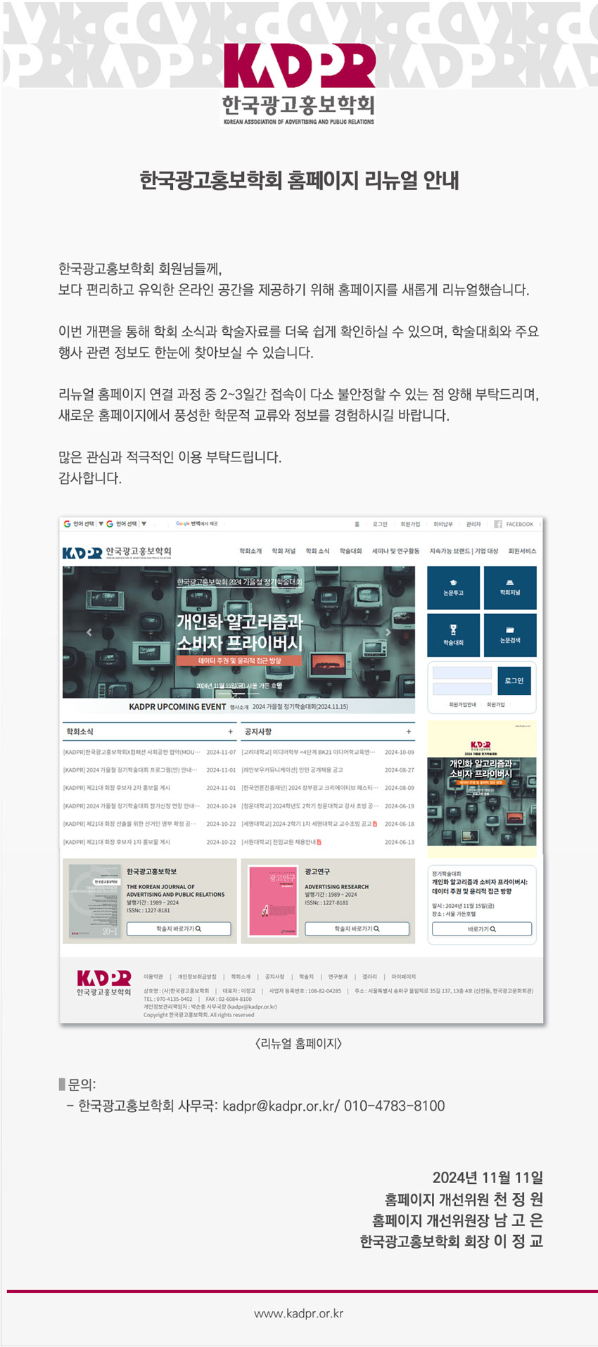 한국광고홍보학회 홈페이지 리뉴얼 안내