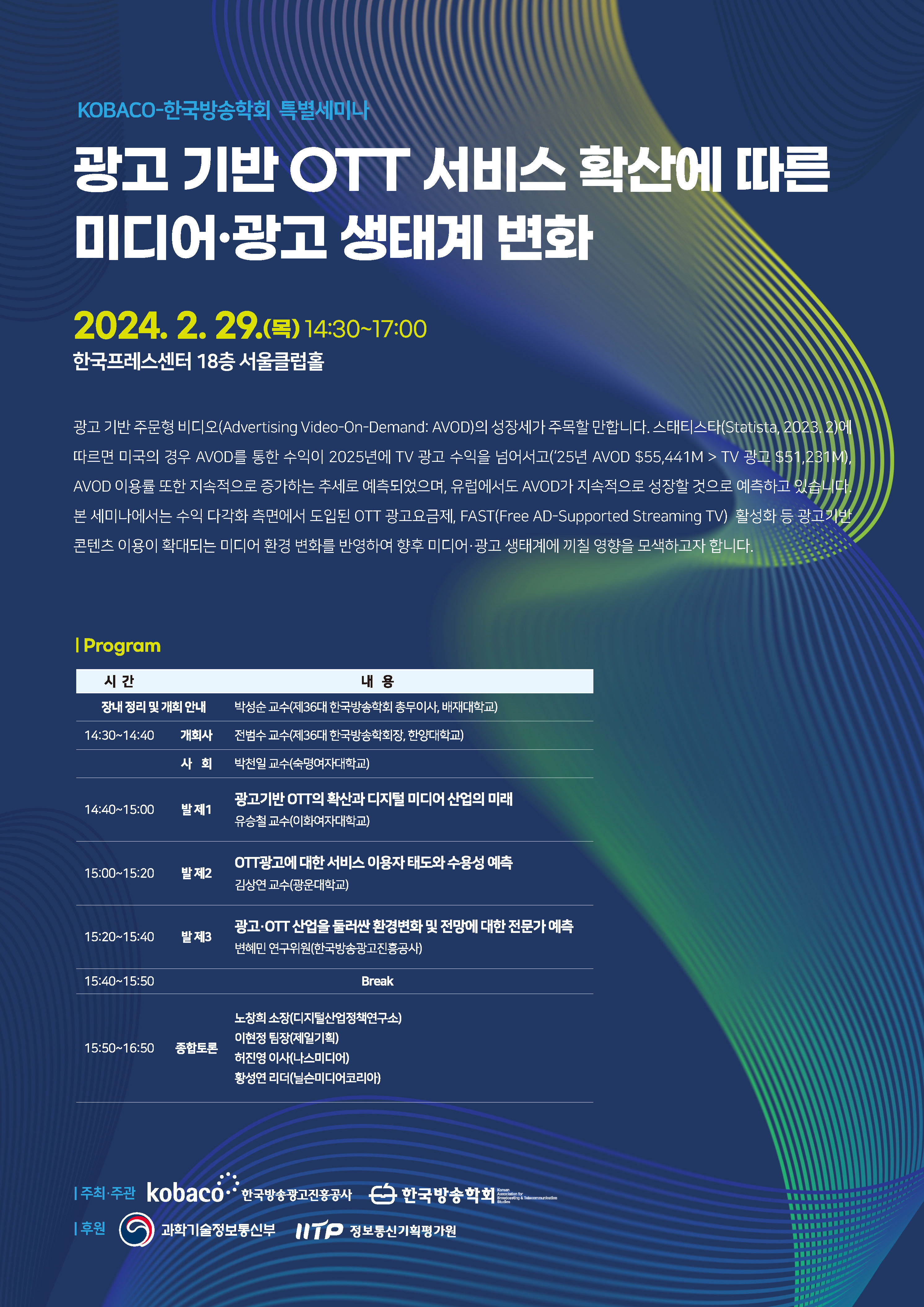 한국방송광고진흥공사(이하 코바코, 사장 이백만)와 한국방송학회(학회장 전범수, 한양대 교수)가 주최·주관하고, 과학기술정보통신부와 정보통신기획평가원이 후원하는‘광고 기반 OTT 서비스 확산에 따른 미디어ˑ광고 생태계 변화’ 세미나가 29일(목) 한국프레스센터 18층 서울클럽홀에서 열렸다.