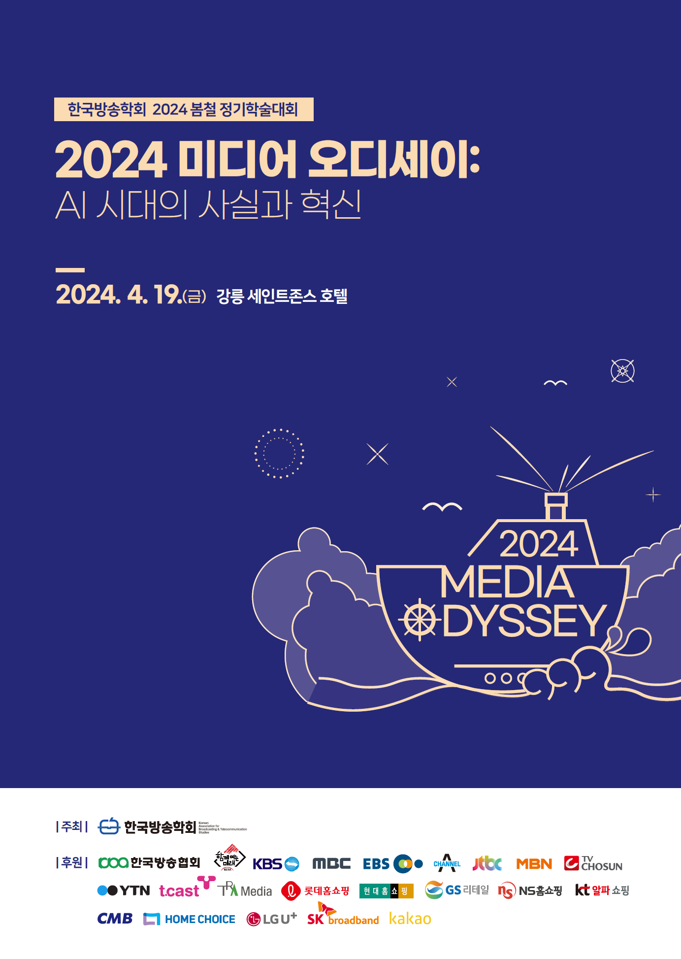 한국방송학회(학회장 전범수, 한양대 교수)는 오는 4월 19일(금)~20일(토) 강릉 세인트존스 호텔에서 “2024 미디어 오디세이: AI 시대의 사실과 혁신”이라는 대주제를 가지고 2024 봄철 정기학술대회를 개최한다. 19일 11시부터 시작되는 이번 정기학술대회에서는 대주제 세션을 비롯해 총 38개 세션에서 80편의 논문이 발표되며, 방송 및 통신 분야의 학·산업계 등 관계자 400여 명이 참석할 예정이다.