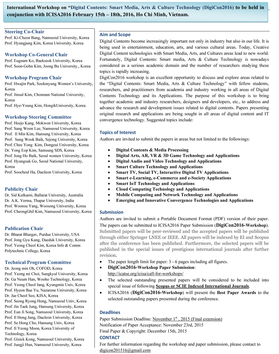 디지털콘텐츠학회에서 국제워크샵(http://icatse.org/icisa)을 개최합니다. 학회 회원님들의 많은 참여를 부탁드리며, Scopus와 SCI급 저널에 우수 논문은 게제를 할 예정입니다. 이번 행사는 2016년 2월 베트남 호치민에서 개최됩니다. DigiCon2016 국제워크샵 논문 마감은11월 16일까지입니다. 논문양식 다운로드 : http://www.springer.com/computer/lncs?SGWID=0-164-6-793341-0 이메일은 digicon201516@gmail.com으로 보내 주십시오. 많은 참여를 부탁드립니다.