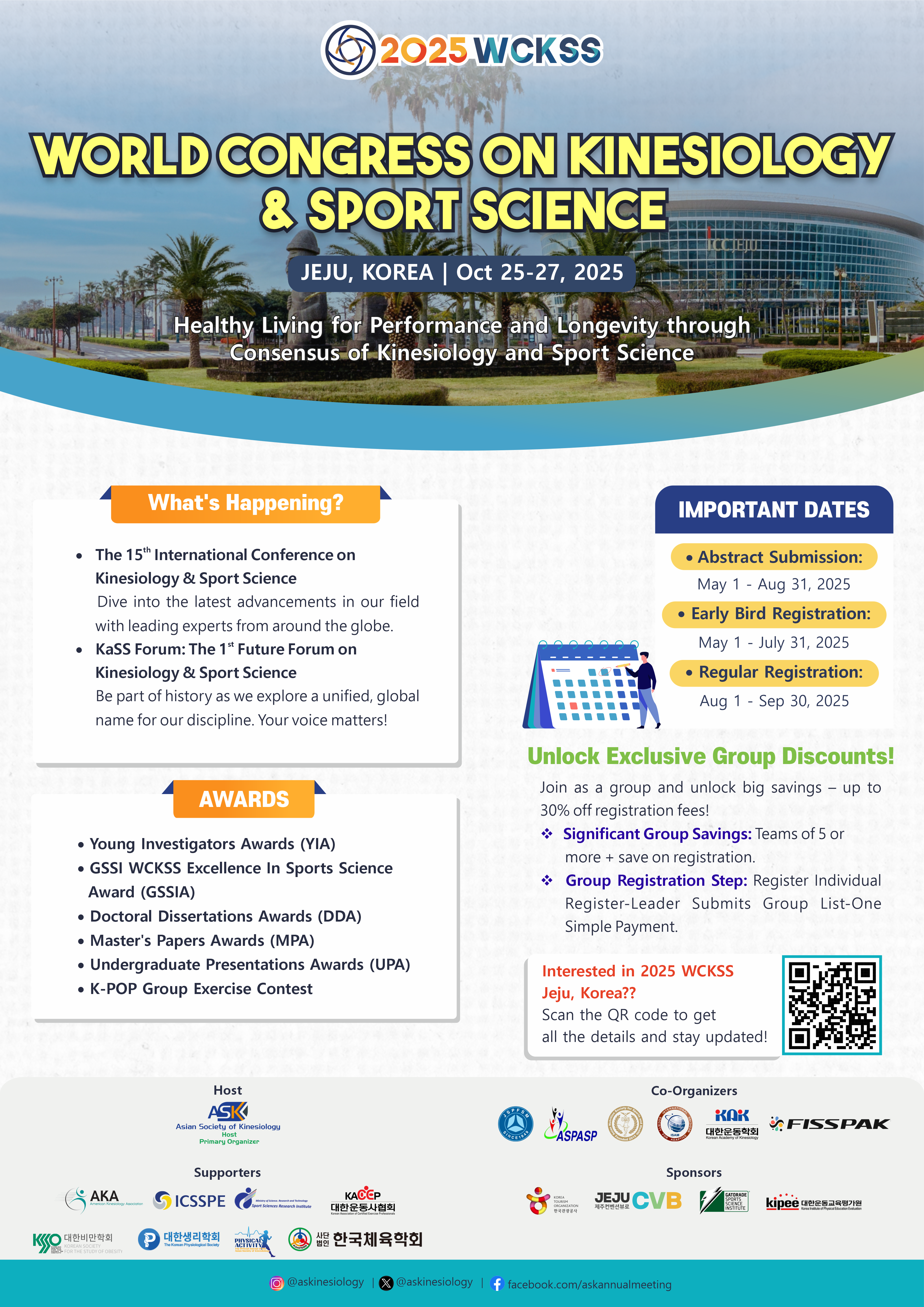 2025년 10월 25~27일 제주도에서 WCKSS 및 제 26회 운동사 대회가 열립니다.