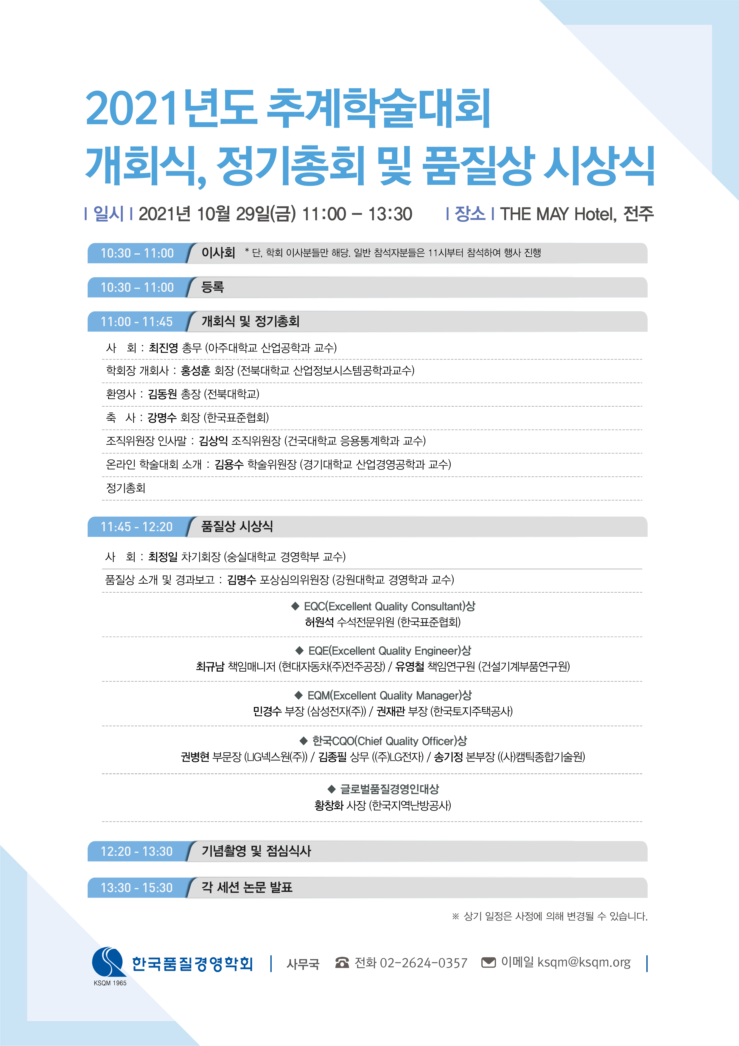 개회식 및 품질상 시상식 참석을 희망하시는 분은 참석 여부를 10월 22일(금)까지 사무국 이메일(ksqm@ksqm.org)로 회신 부탁드립니다.