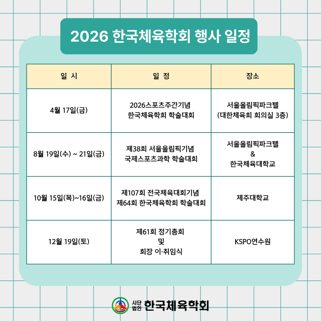 2026년도 한국체육학회 주요 행사 일정(안)을 아래와 같이 공유드립니다. 관련 내용을 확인하시어 향후 일정 계획에 참고하여 주시기 바랍니다.