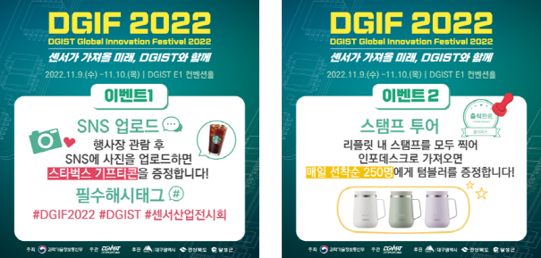 1. DGIST(대구경북과학기술원)에서는 매년 DGIF(DGIST Global Innovation Festival) 행사를 개최하고 있으며, 2022년에는 센서와 반도체를 주제로 11월 9일(수)~10(목)에 개최합니다.