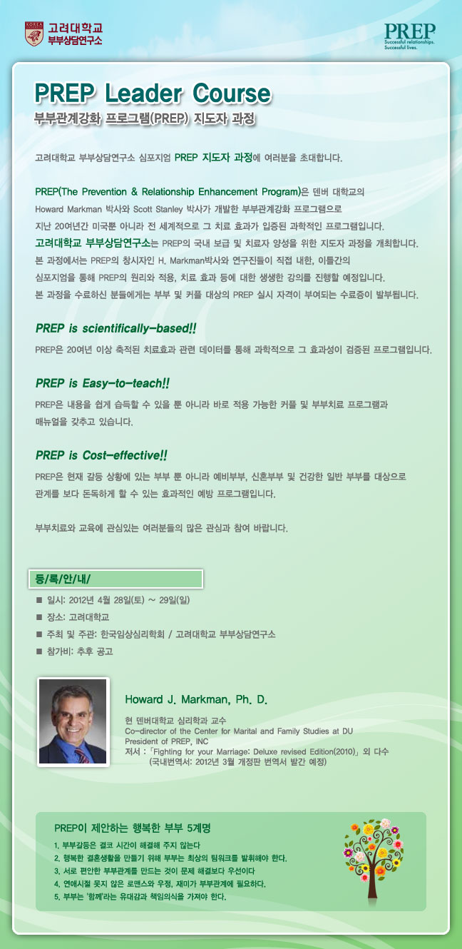 과정을 개최합니다. 본 행사는 PREP의 창시자인 덴버대학교 심리학과 교수인 Howard Markman박