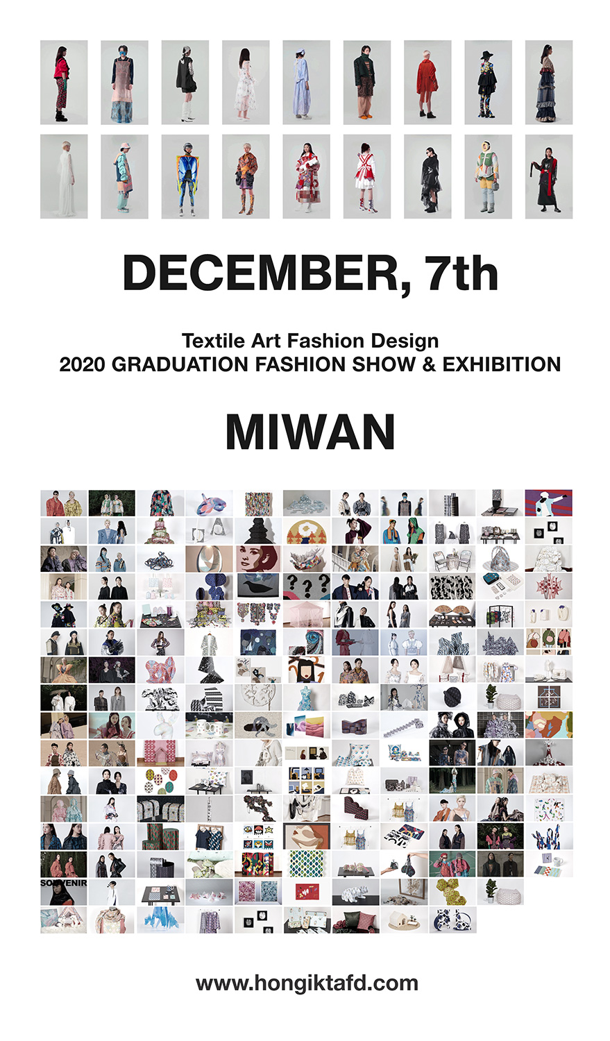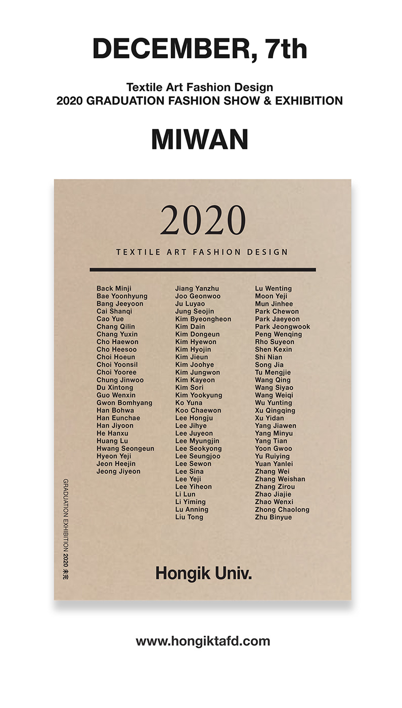 2020년 홍익대학교 섬유미술패션디자인과 온라인 졸업전시회를 12월 7일(월) 전용 홈페이지(www.hongiktafd.com)를 통해 오픈합니다. 팬데믹 속에서 함께 협업하여 창의적 열정을 담은 디지털 졸업 전시를 기획하였습니다. “미, 완 (Mi Wan)”이라는 주제로 88명의 졸업생이 다양하고 창의적인 섬유미술,텍스타일디자인, VR 패션쇼 등을 디지털 전시로 준비하였으니, 섬유미술패션디자인과 온라인 졸업 전시에 많은 관심과 참여 부탁드립니다.