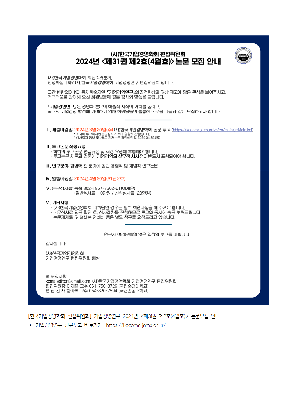 [한국기업경영학회 편집위원회] 기업경영연구 2024년 <제31권 제2호(4월호)> 논문모집 안내