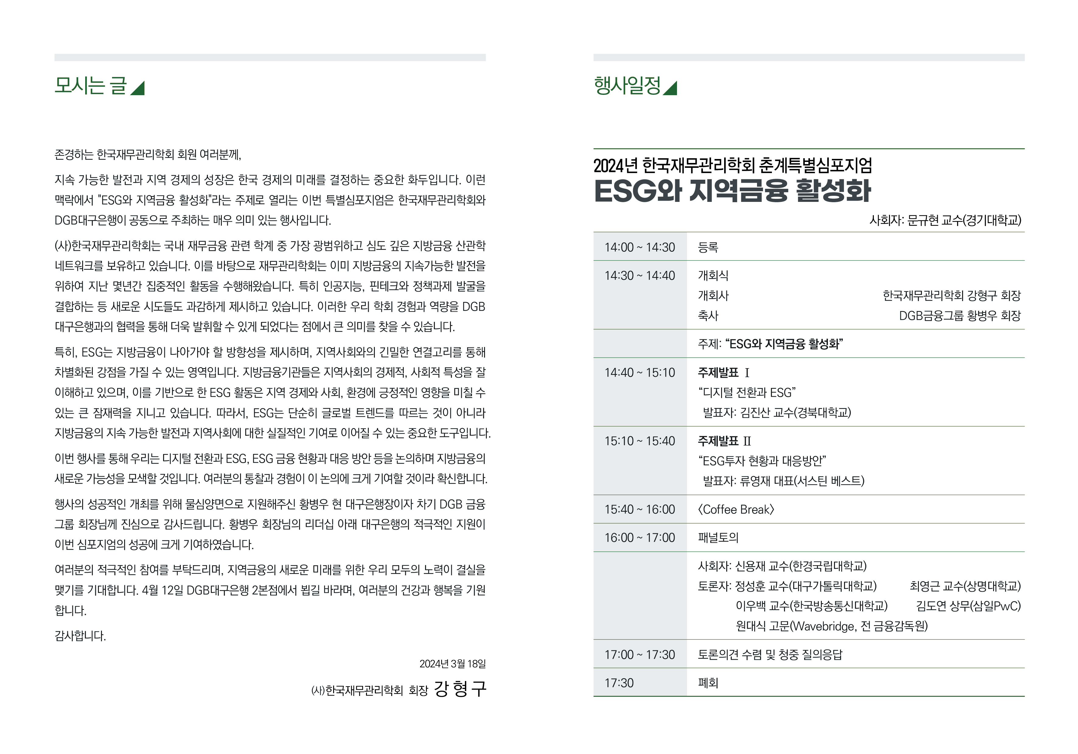지속 가능한 발전과 지역 경제의 성장은 한국 경제의 미래를 결정하는 중요한 화두입니다. 이런 맥락에서 'ESG 지역금융 활성화'라는 주제로 열리는 이번 특별심포지엄은 한국재무관리학회와 DGB대구은행이 공동으로 주최하는 매우 의미 있는 행사입니다.