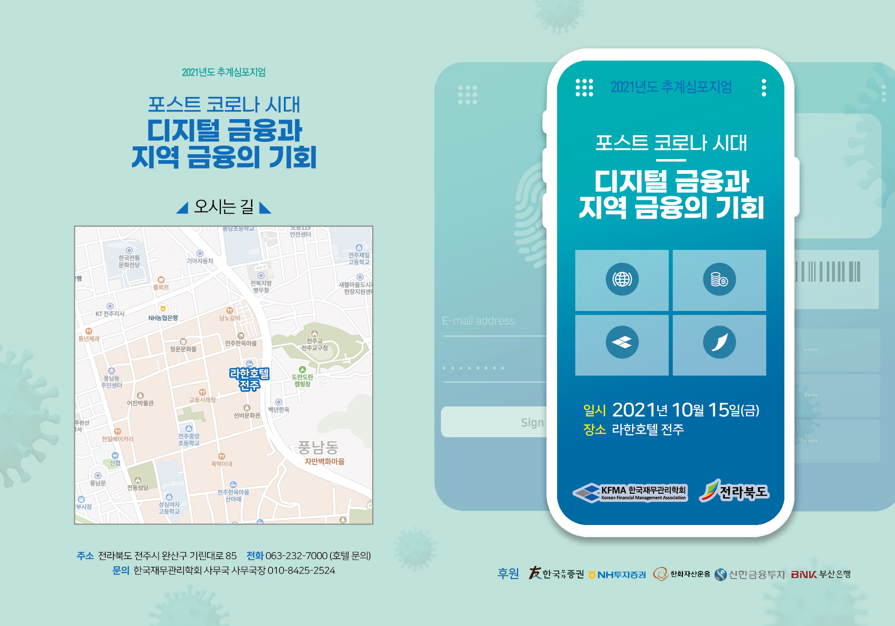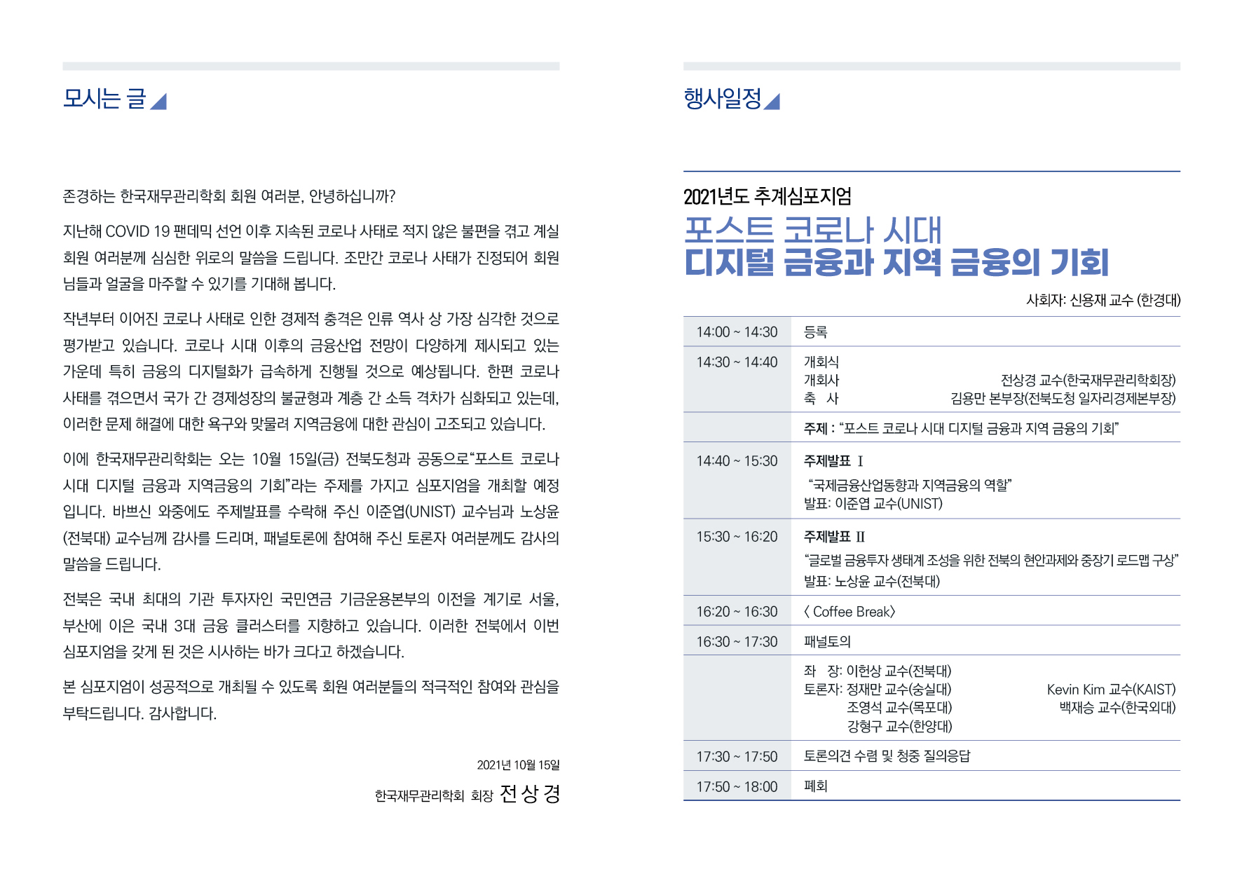 지난 안내에 공지한 바와 같이 다가오는 2021년 10월 15일(금), 전주에서 전북도청과 공동으로 한국재무관리학회 추계 공동심포지엄를 아래와 같이 개최됩니다.