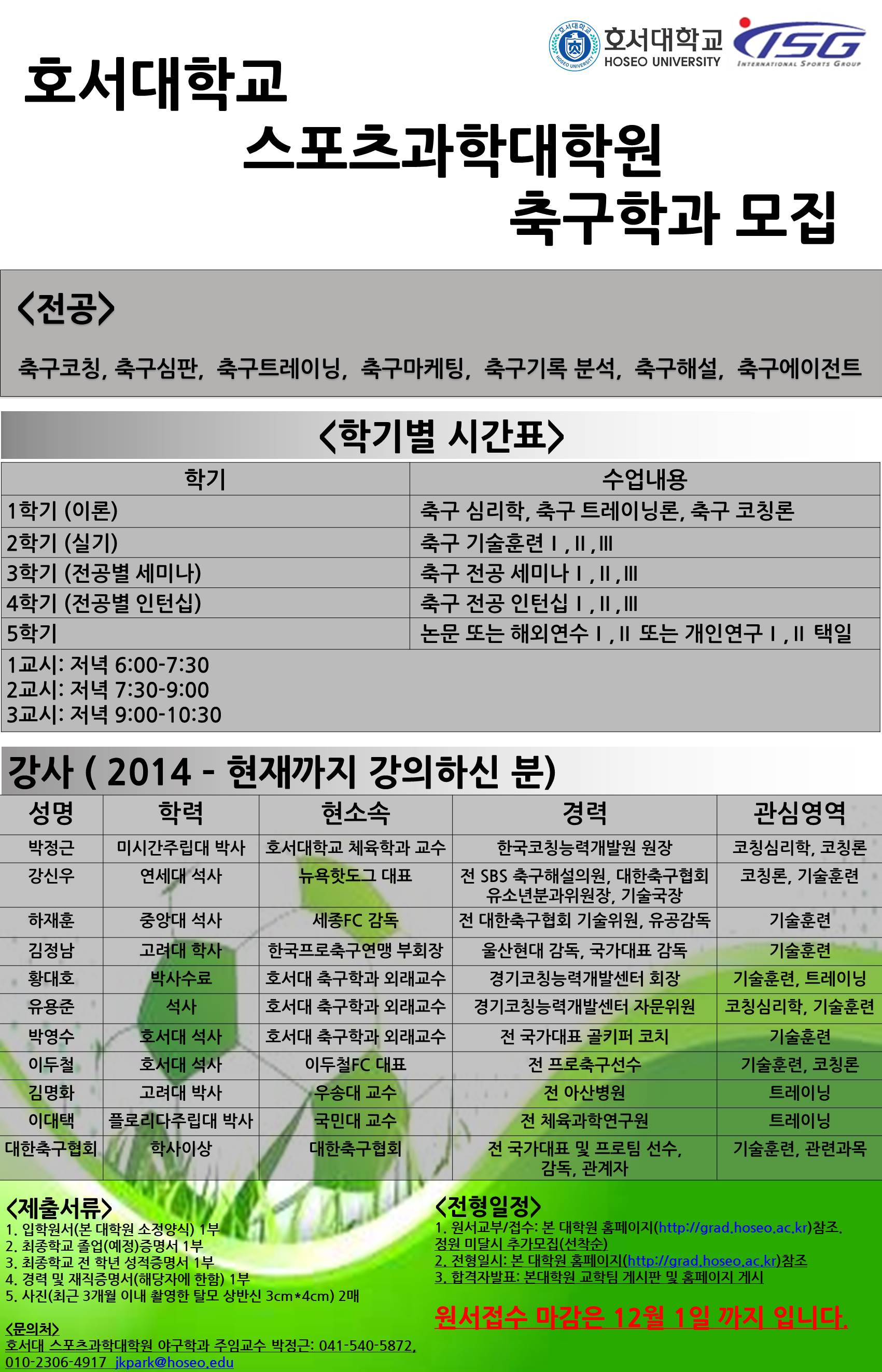 호서대학교 스포츠과학대학원 축구학과에서 대학원생을 모집합니다. 첨부파일을 참조하시고 문의사항은 010-2306-4917로 직접 문의하시기 바랍니다. 접수마감일은 12월1일 입니다.