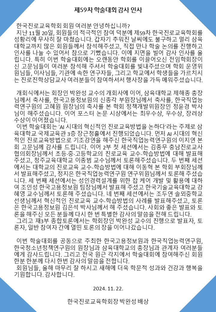 [한국진로교육학회] 제59차 추계학술대회 개최에 따른 감사의 글