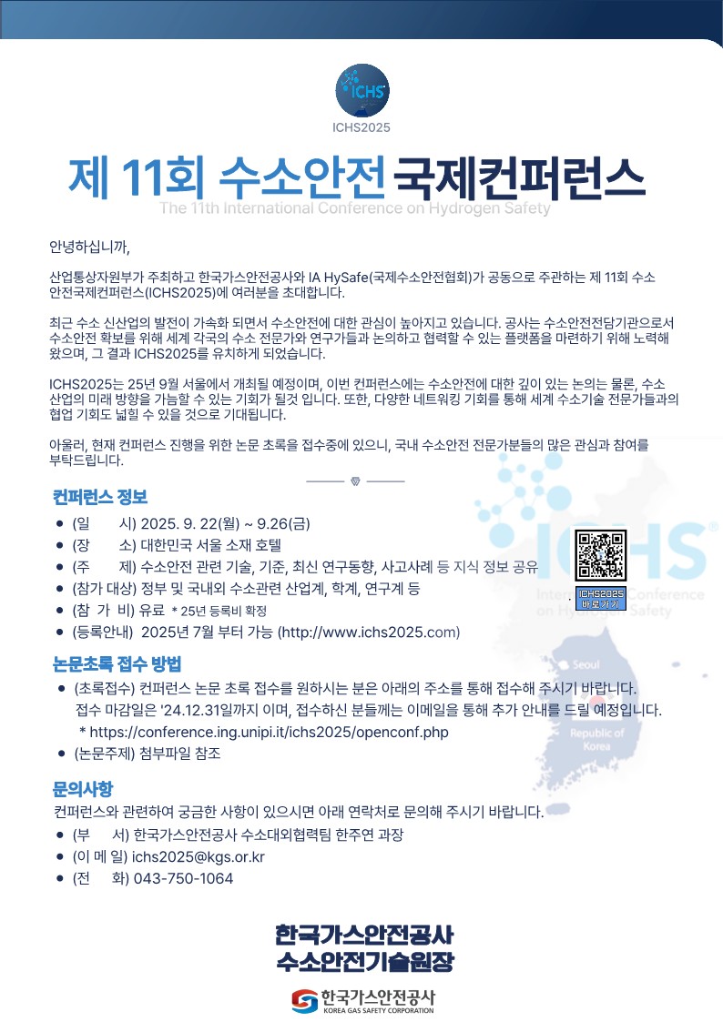 제11회 수소안전 국제컨퍼런스가 2025년 개최 예정이오니 관심있는 회원님들은 아래 또는 첨부의 내용 참고하시기 바랍니다.