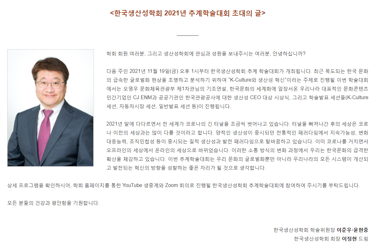 한국생산성학회에서 2021년 추계학술대회 및 생산성CEO대상 시상식을 다음과 같이 개최합니다.