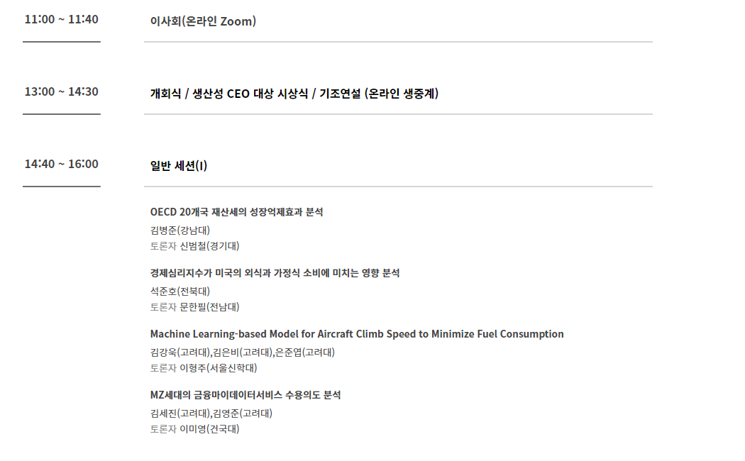 ▶ 참가방법:  개회식, 생산성CEO대상 시상식, 기조연설은 유튜 브 생중계로, 학술세션은 줌(Zoom)으로 참여 가능하십니다. 아래 공식 웹페이지에 접속하시어 상세 내용을 확인해 주시면 감사하겠습니다.