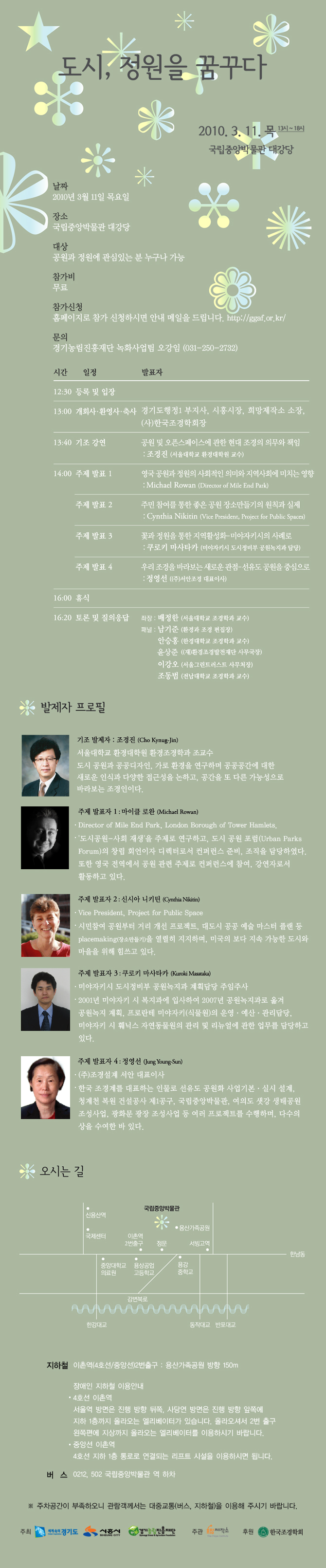 창조적인 공원과 정원 만들기 국제 심포지엄은 공원에 관한 새로운 상상력으로 도시에 활력을 불어넣은 각국의 다양한 사례와 경험을 나누고 새로운 대안을 모색하는 자리입니다. 특히 녹지 인프라 확장과 시민의 참여, 도시 재생이라는 주제에 따라 각국의 사례들을 나누고, 우리 공원의 나아갈 방향에 대한 깊이 있는 토론을 통해 해법을 살펴보고자 합니다. 많은 관심과 참여 부탁드립니다. 장소 : 국립중앙박물관 대강당 날짜 : 2010년 3월 11일 목요일 13시~18시 참조 : www.ggaf.or.kr 문의 : 경기농림재단 녹화 사업팀 오강임(031-250-2732)