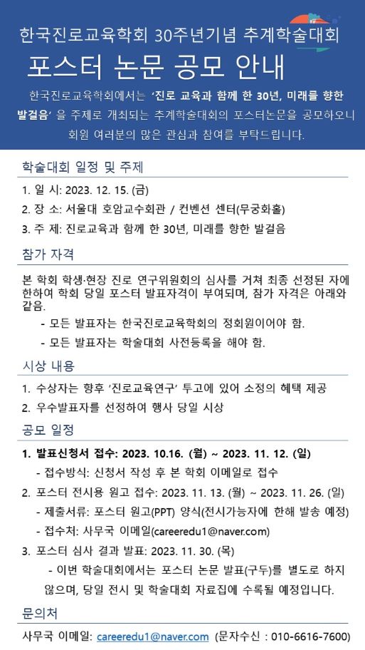[공지] [한국진로교육학회] 30주년 기념 추계학술대회 포스터 논문 공모 접수 안내