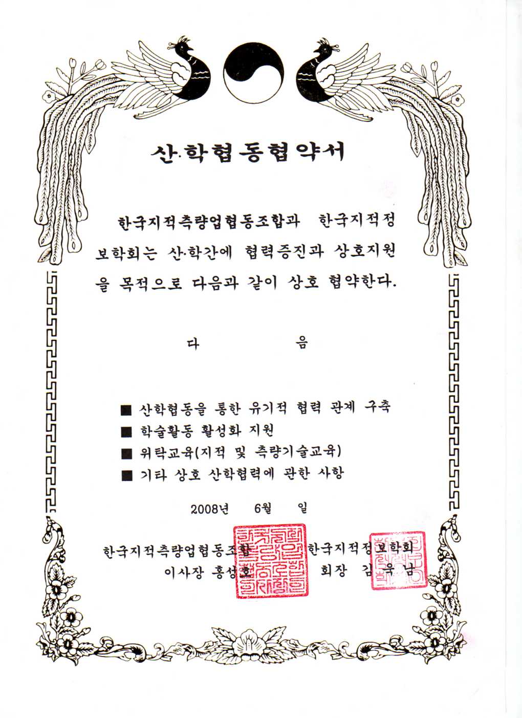 2008년 6월 한국지적정보학회(회장 김욱남)와 한국지적측량협동조합(이사장 홍성호)간에 산학협동협약을 체결하였습니다.