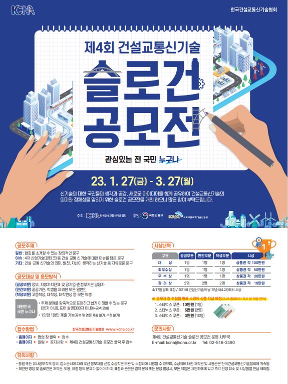 한국건설교통신기술협회는 건설교통신기술을 널리 알리고 새로운 이미지를 구축하기 위하여 슬로건 공모전을 2020년부터 매년 개최하고 있습니다.