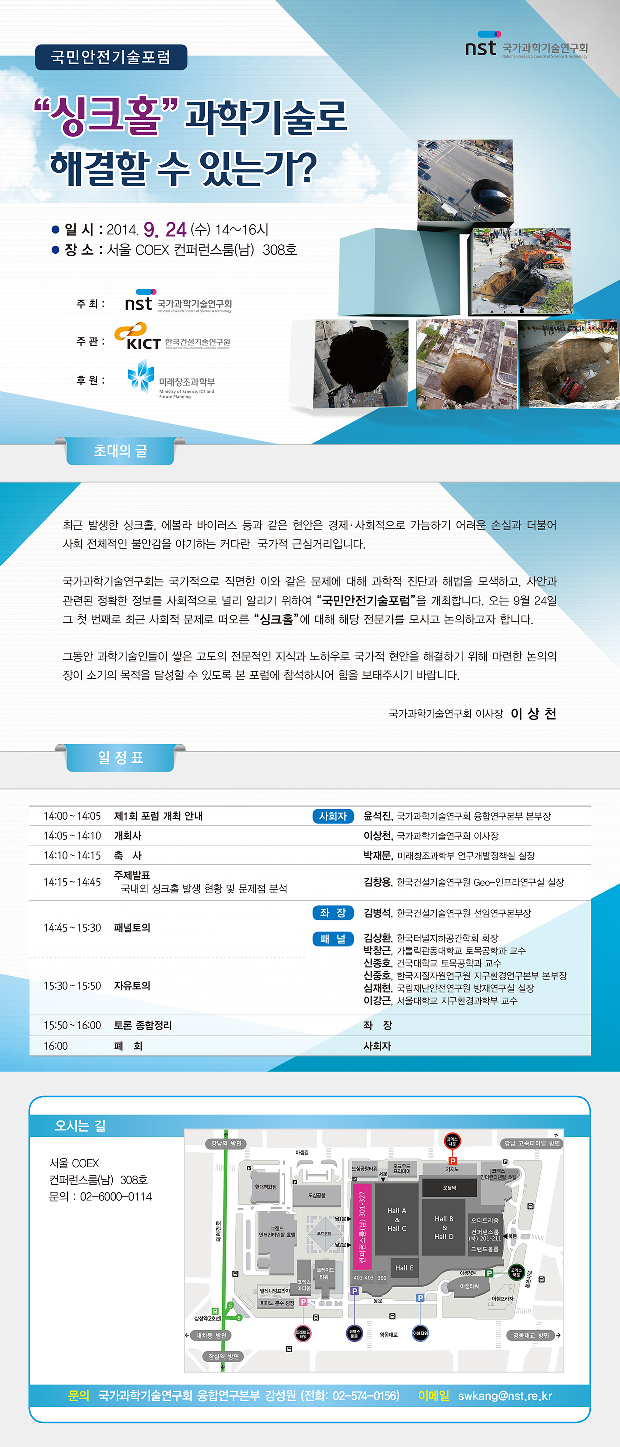 미래창조과학부 산하 국가과학기술연구회에서 국민안전기술포럼을 설립하여,「 싱크홀 과학기술로 해결할 수 있는가?」라는 주제로 첫 번째 토론회를 개최합니다.