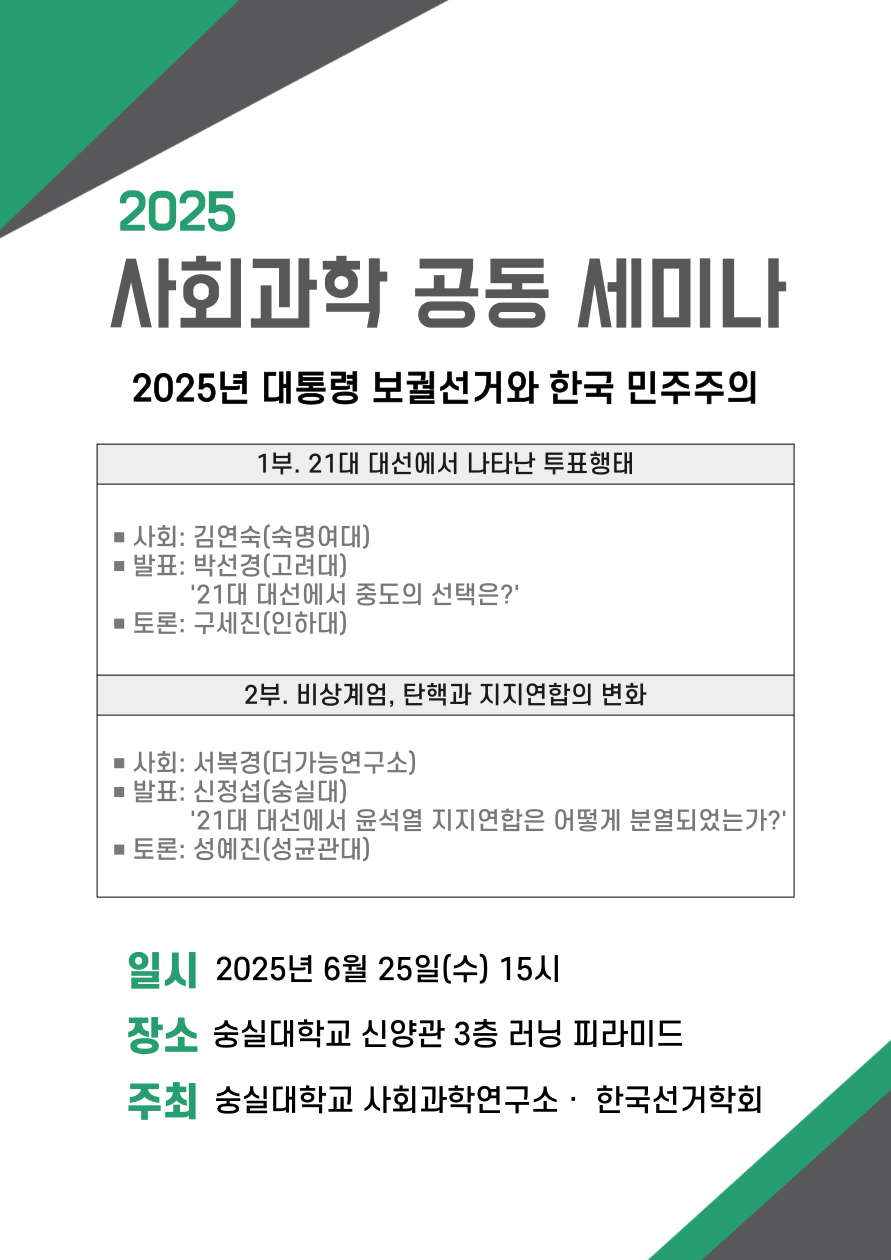 숭실대학교 사회과학연구소와 한국선거학회가 공동으로 주관하여 사회과학 공동세미나를 개최하오니 많은 참여 바랍니다.