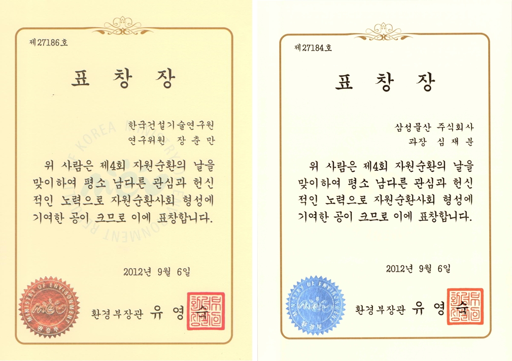 자원순환의 날을 맞아 9월 5일 환경부와 자원순환의 날 조직위원회가 일산 킨텍스에서 개최한 ‘제 4회 자원순환의 날 기념식’에서 우리 학회 사업이사 심재분(삼성물산) 회원과 생활폐기물 이송관로설비 분과 회장을 역임하였던 장춘만(한국건설기술연구원) 회원이 환경부 장관 표창을 수상하였다.