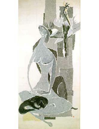분할된 면들은 작은 붓터치의 얼룩으로 볼륨감있게 처리하면서 인체의 모습을 과장시켜 표현하였다. 그러나 붓터치는 우연한 얼룩이 아니라 음영을 암시하면서 정교하게 찍은 것으로 심지어 얼룩점의 가장자리를 흰선으로 강조한다. 여인의 주위를 에워싸고 있는 검은 그림자, 날카로운 가시와 나뭇가지, 그리고 그 가지에 찔린 듯 관통당하고 거꾸로 매달린 새, 웅크리고 있는 검은 고양이는 불안한 현실을 반영하며 여인은 그 모든 것을 포용하듯 조용히 묵상한다.