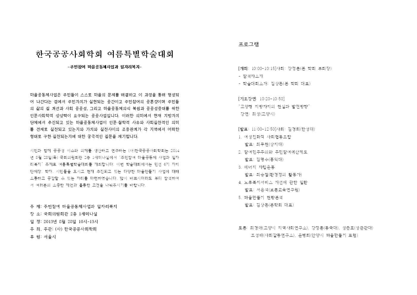 시민과 함께 공공성 이슈와 의제를 생산하고 연구하는 (사)한국공공사회학회는 2014년 8월 28일(목) 국회의원회관 2층 1세미나실에서 “주민참여 마을공동체 사업과 일자리복지” 주제로 여름특별학술대회를 개최합니다. 이번 학술대회에서는 민선 6기 자치단체장, 학자, 시민들을 모시고 현재 추진되고 있는 다양한 마을만들기 사업에 대해 소통하고 공감할 수 있는 자리를 마련하였습니다. 많이 바쁘시더라도 부디 참석하셔서 여러분의 소중한 제언과 훌륭한 고견을 나눠주시기를 바랍니다.