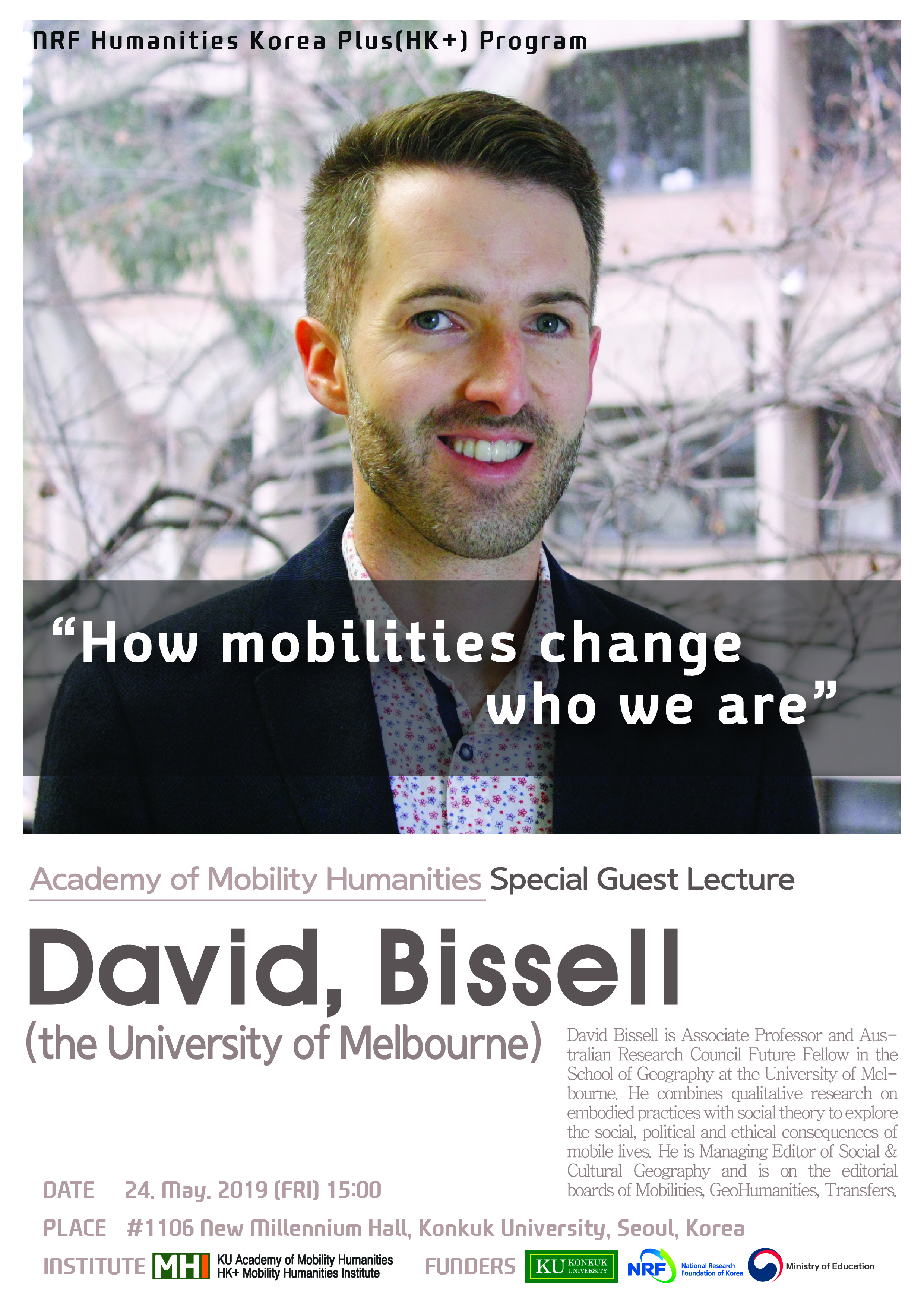 오는 5월 24(오후 3시부터 호주 멜버른 대학의 데이비드 비셀(David Bissell) 교수님을 모시고 해외저명학자초청강연을 개최합니다.